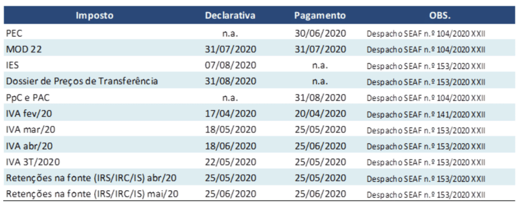 Order No. 141/2020-XXII of 6 April provides that, without any additions or penalties, the periodic VAT returns to be delivered within the legal period provided for in Article 41(1). ° of the CIVA, for the period of February 2020, may be submitted by April 17. The delivery of the chargeable tax resulting from the periodic declarations referred to in the preceding paragraph may be made by 20 April, without prejudice to the accession to the payment scheme in instalments which is applicable.